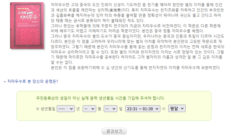 위 주소로 들어가셔서 꼭 "음력" 으로 결과를 넣으셔야 제대로 된 결과를 받아보실 수 있습니다.