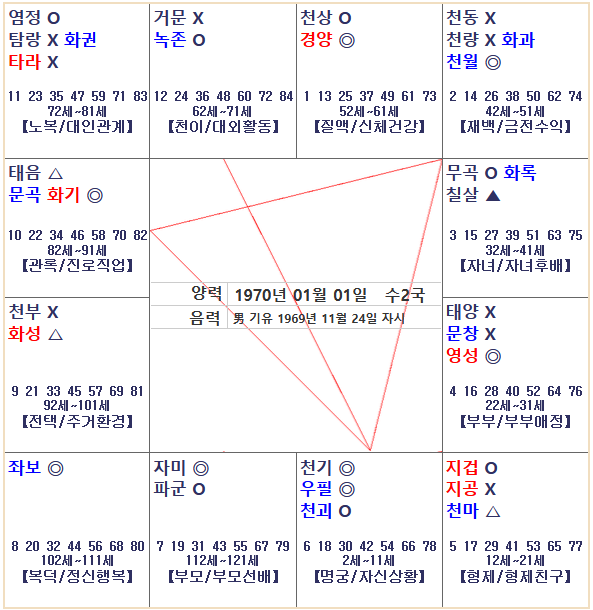 여기서 그 궁의 주성과 삼방 (삼합을 하는 자리 - 빨간색 삼각형 화살표)