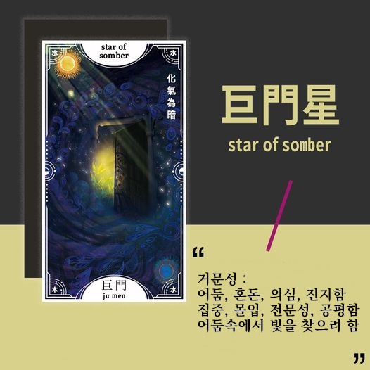 그래서 자미두수에서 바로 해석을 위해 써야 하는 거문의 뜻은 혼돈, 어둠, 진지함, 몰입, 전문성 과 같은 뜻이라고 볼 수 있습니다.