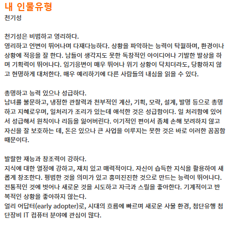 예를 들어 명궁/자신상황에 천기 : 비범형, 재기발랄 은 자신에 대한 설명입니다.