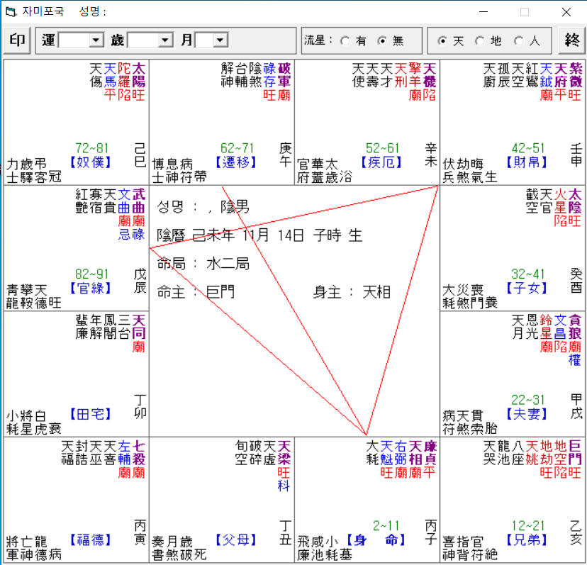 위의 화면은 자미두수 무료 프로그램으로 명반을 작성했을 때 나오는 자미두수 명반입니다.