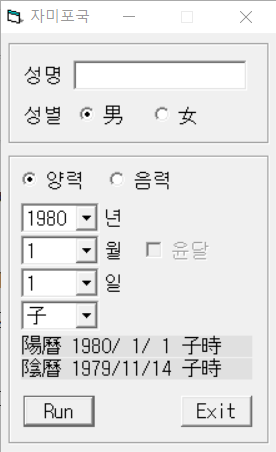 위의 입력화면에서 성별, 생년월일을 입력하고 밑에 " Run " 버튼을 누르면 바로 명반이 출력이 됩니다.