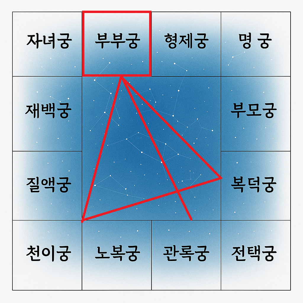 부처궁의 삼방사정(三方四正)에서는 복덕궁(福德宮), 사업궁(事業宮), 천이궁(遷移宮)이 만납니다. 이러한 배치는 매우 논리적인 구조를 갖고 있습니다.