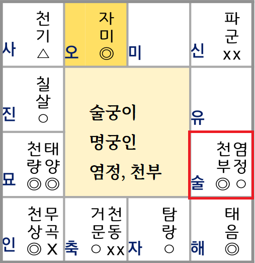- 명궁(命宮): 염정(廉貞)과 천부(天府)가 술궁에 위치