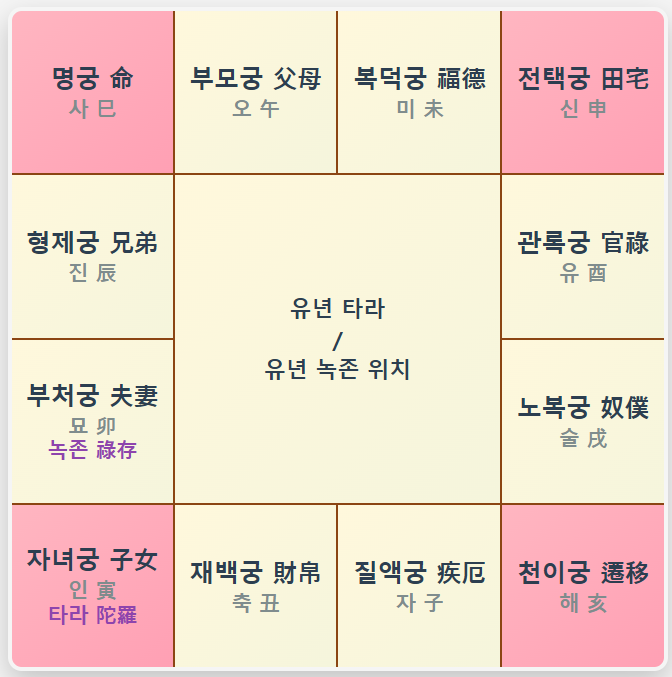 2025년 유년 타라성 위치 해석 자녀궁 (子女宮): '집 밖의 공간', '외부 활동', '자녀 관계', '협력 관계' 등을 나타냅니다. 전택궁 (田宅宮): '개인의 주거 공간', '부동산', '재산', '안정성' 등을 의미합니다. 타라성 (陀羅星): '지연', '장애', '반복되는 문제', '내적인 고뇌' 등을 상징하는 별입니다.